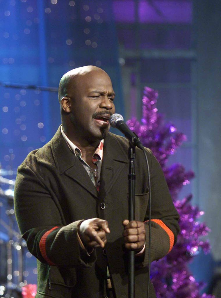 THE TONIGHT SHOW WITH JAY LENO — Episode 2841 — Pictured: Musical guest BeBe Winans performs on December 21, 2004 — (Photo by: Paul Drinkwater/NBC/NBCU Photo Bank via Getty Images) vertical,indoors,color image,photography,people,one person,arts culture and entertainment,usa,radio,television show,performance,singer,california,humor,christmas,tree,singing,christmas tree,bebe winans,burbank,2000s style,the tonight show with jay leno,musical guest,talkshow,season 13,late night television